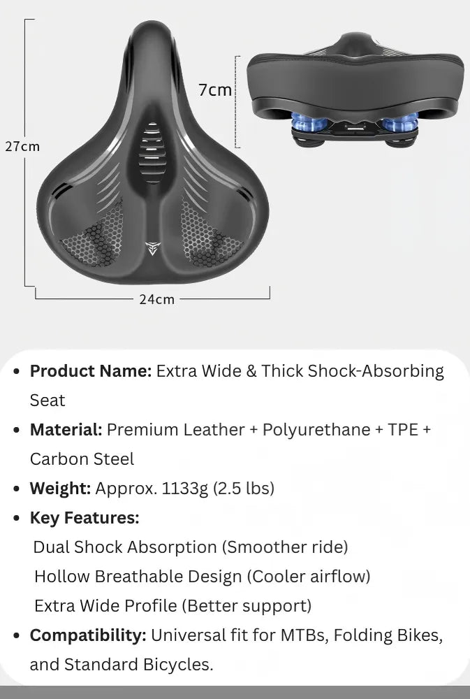 Transform painful rides into joyrides with this 33cm extra-wide bicycle seat. Heavy-duty at 1133g, it features a no-chafe profile and dual shock balls to offer sofa-like support for larger riders.