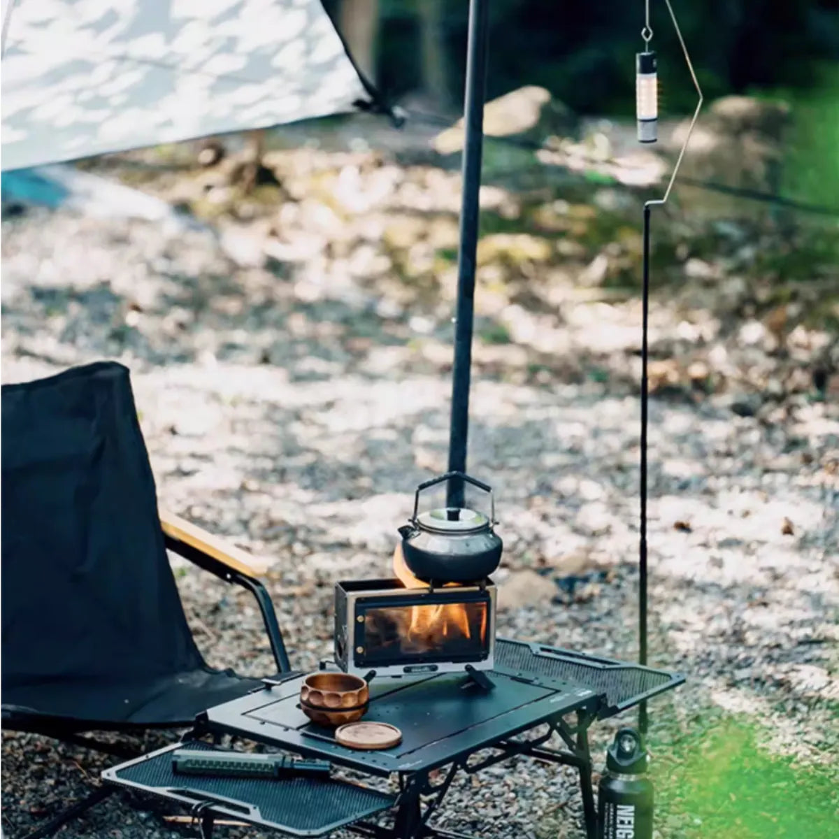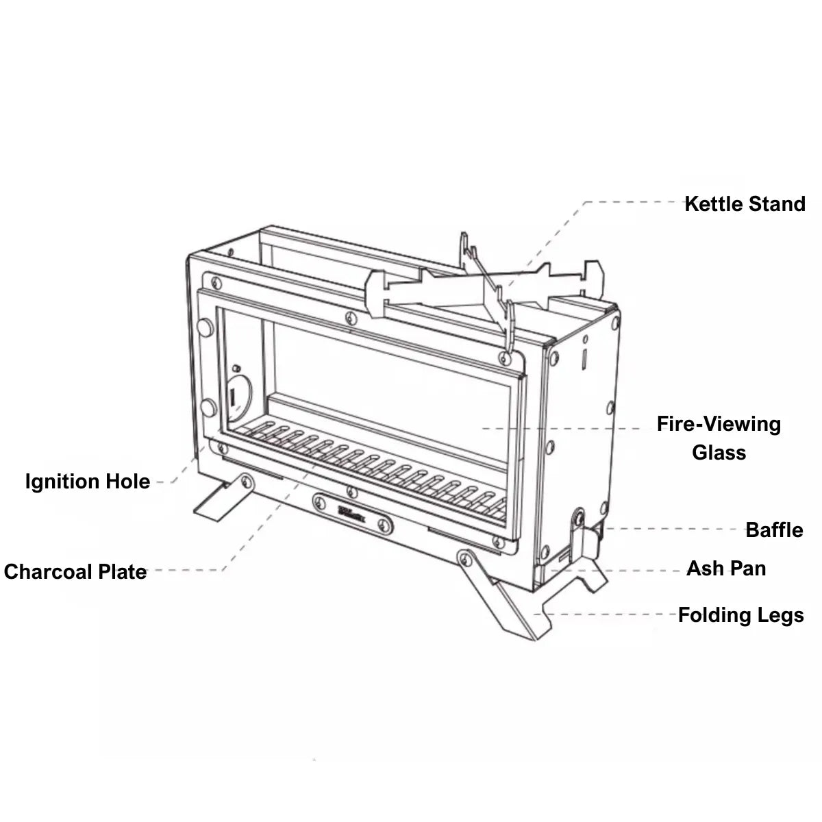Ditch the heavy gear without sacrificing warmth. This ultra-light 1.1kg wood burner brings the cozy glow of a fireplace to your campsite. Cook, heat, and watch the flames dance through the large glass window.
